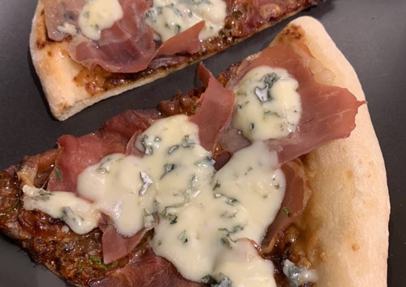 #pizza #fun #vegas #prosciutto #cheese #gorgonzola #fig #finger #food #meal #dinner #tv #slice #baked #oven