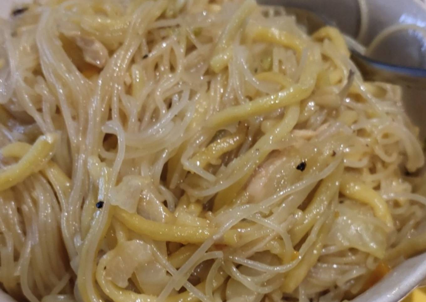 - Stir fry shallots until soft then add chickenbcook them then add both miki and glass noodle.Mix well and pour water from the chicken.Cook it until noodles are soft.