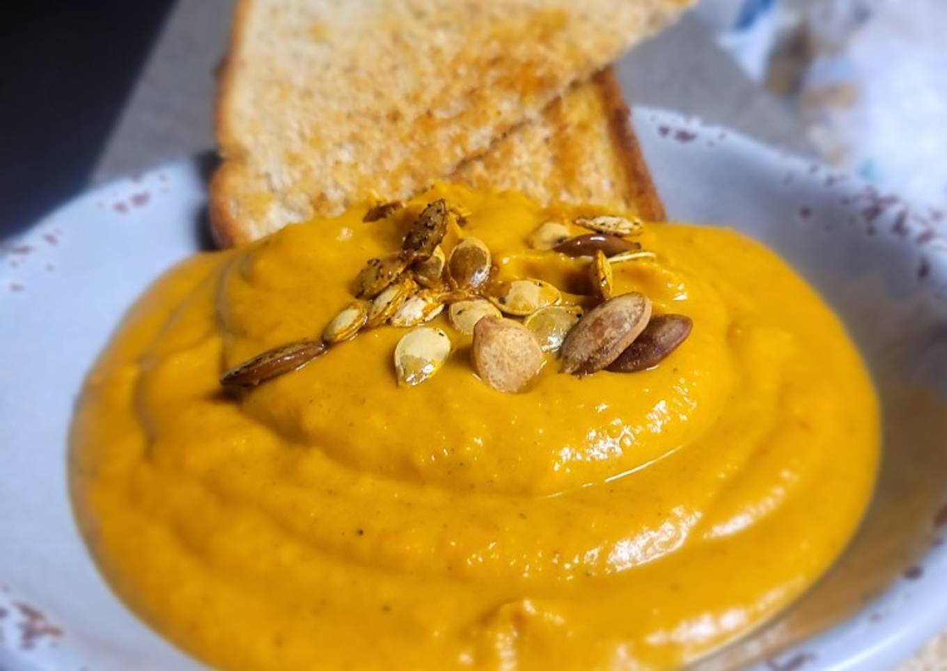 - Once the soup is velvety smooth pour back into the pot. Than place your 6oz portion into a bowl and Sprinkle your seeds on top 😉