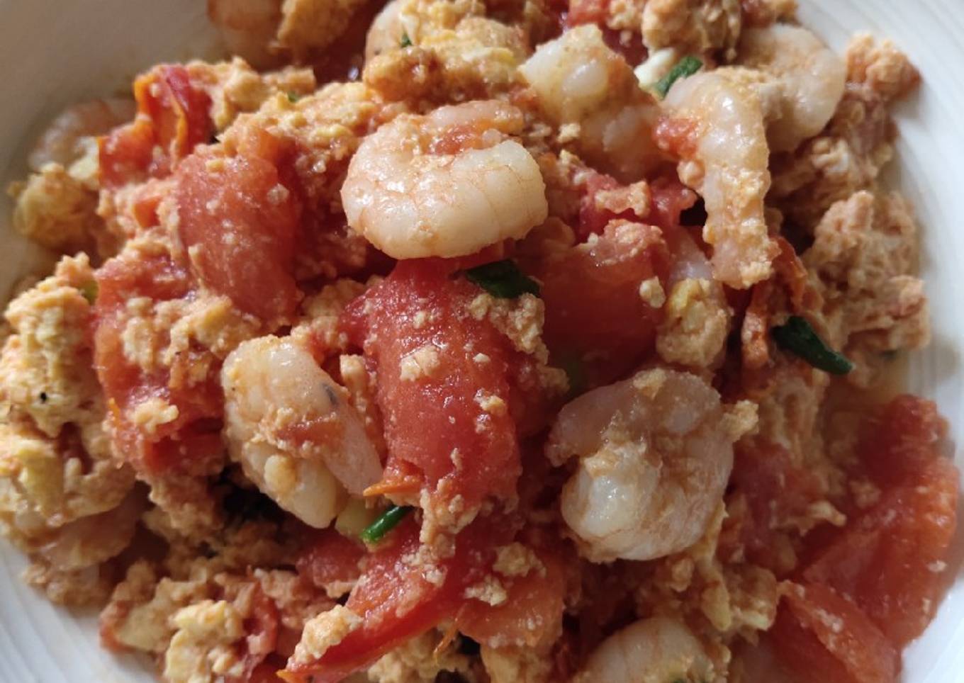 - Heat a pan.then add.oil.Drop tomatoes and cook until half done.Add in.shrimps cook until color changrs then.pour eggs.Letbit sit a while before mixing it.Cook until done.