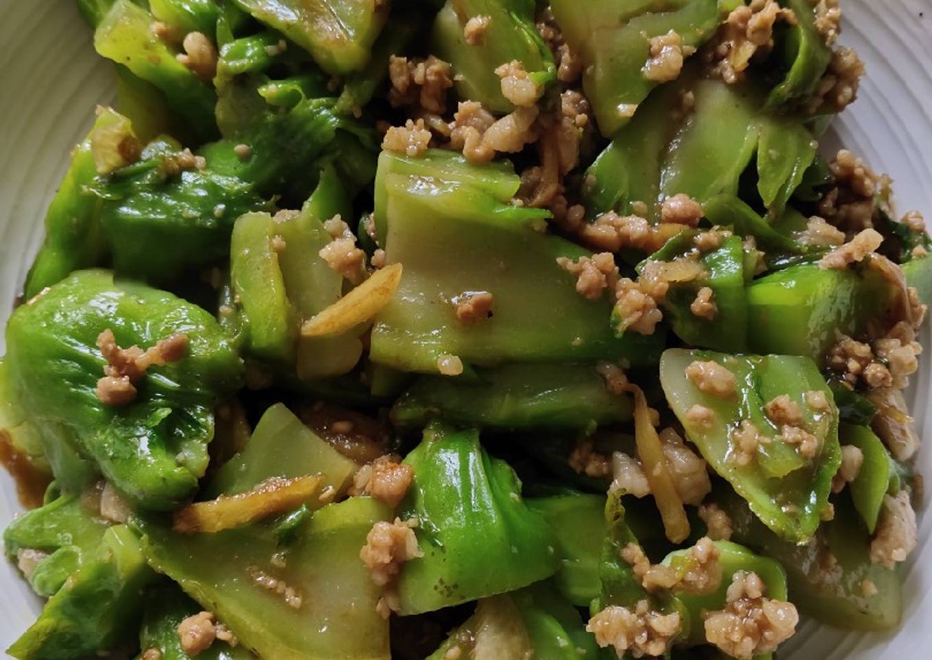 - Heat a wok and saute ginger and garlic until golden brown and then remove.In same wok stir fry veggies and splash a little water and salt.Cover to simmer.When.its already cook mix half of the fried ginger and garlic then mix.Scoop in a plate then garnish the remaing garlic and ginger on top.Serve