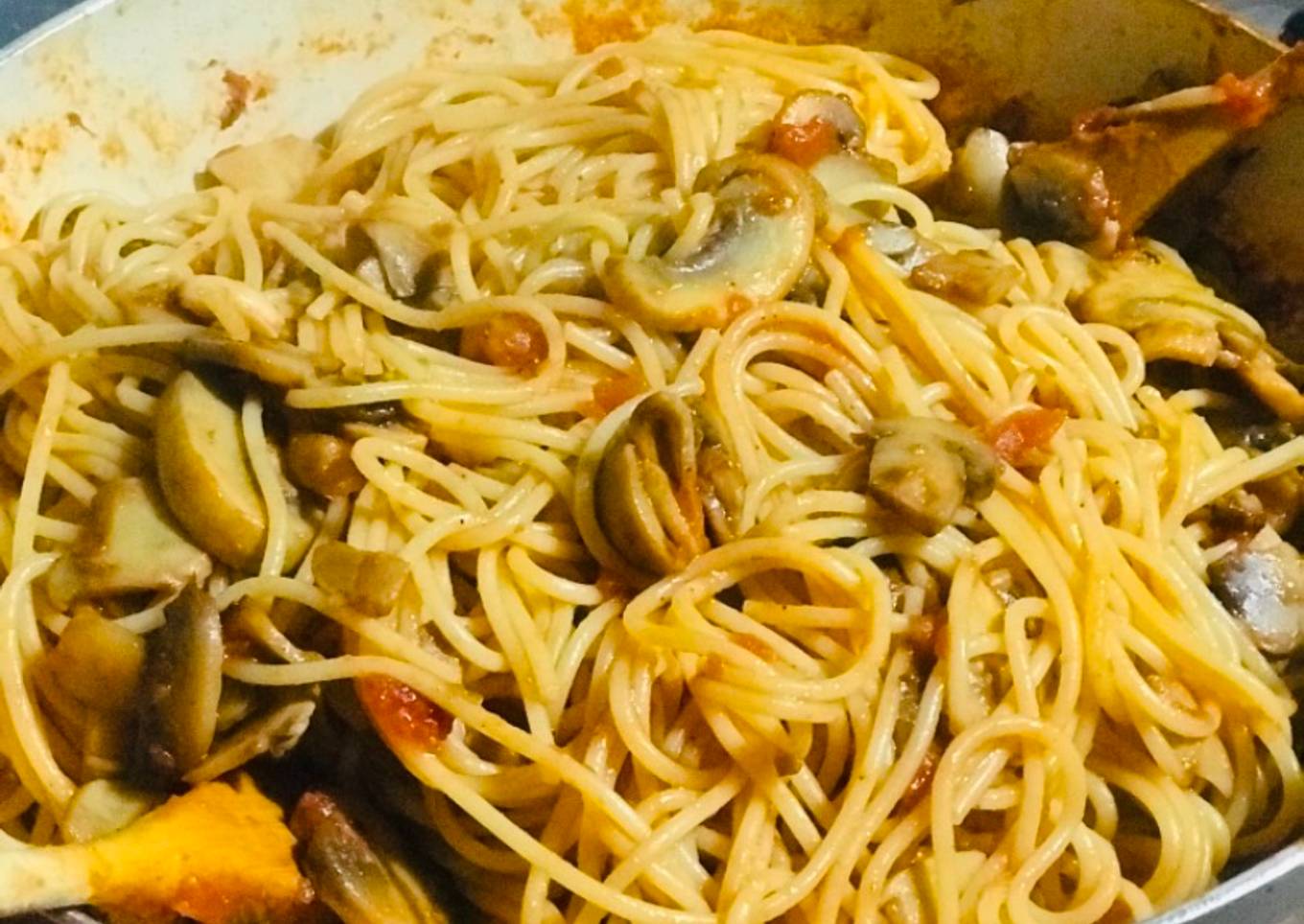 - Transfer pasta to the pan with mushrooms and toss to combine.