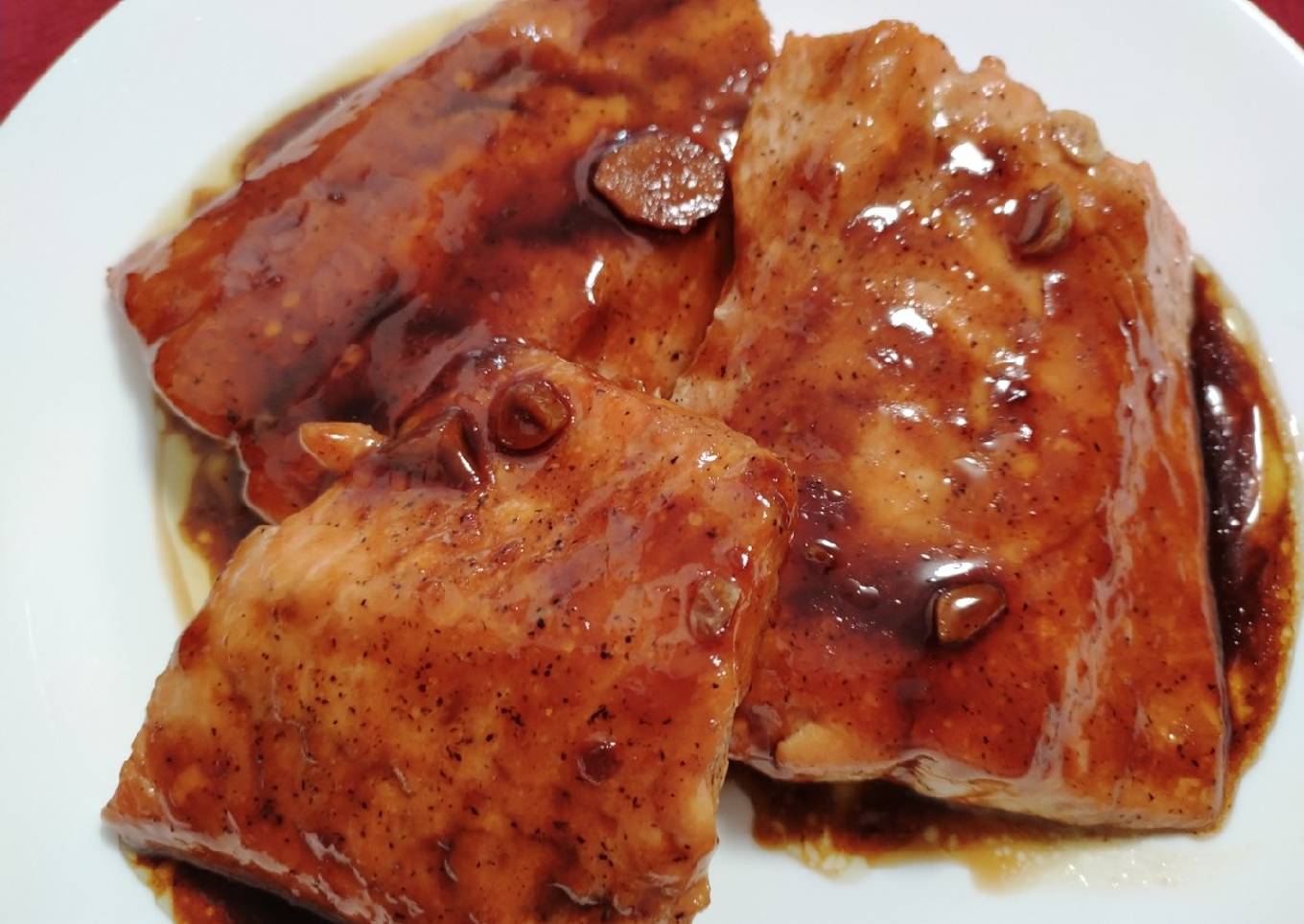 - Add a splash of veg oil to a large pan on medium heat. Lay the salmon fillets into the pan, skin-side down, and fry for about 2 minutes. Pour the marinade in around the salmon, and continue frying another 2 to 3 minutes, depending on thickness. Carefully flip the fillets over and fry them another 4 to 5 minutes until done, basting them frequentlywith sauce. Remove the fillets to a plate, skin-side up.