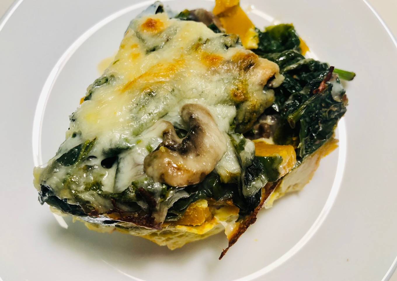 - Add the spinach and mushroom on top of pumpkin slices. Pour the egg evenly on them. Sprinkle shredded cheese on top.