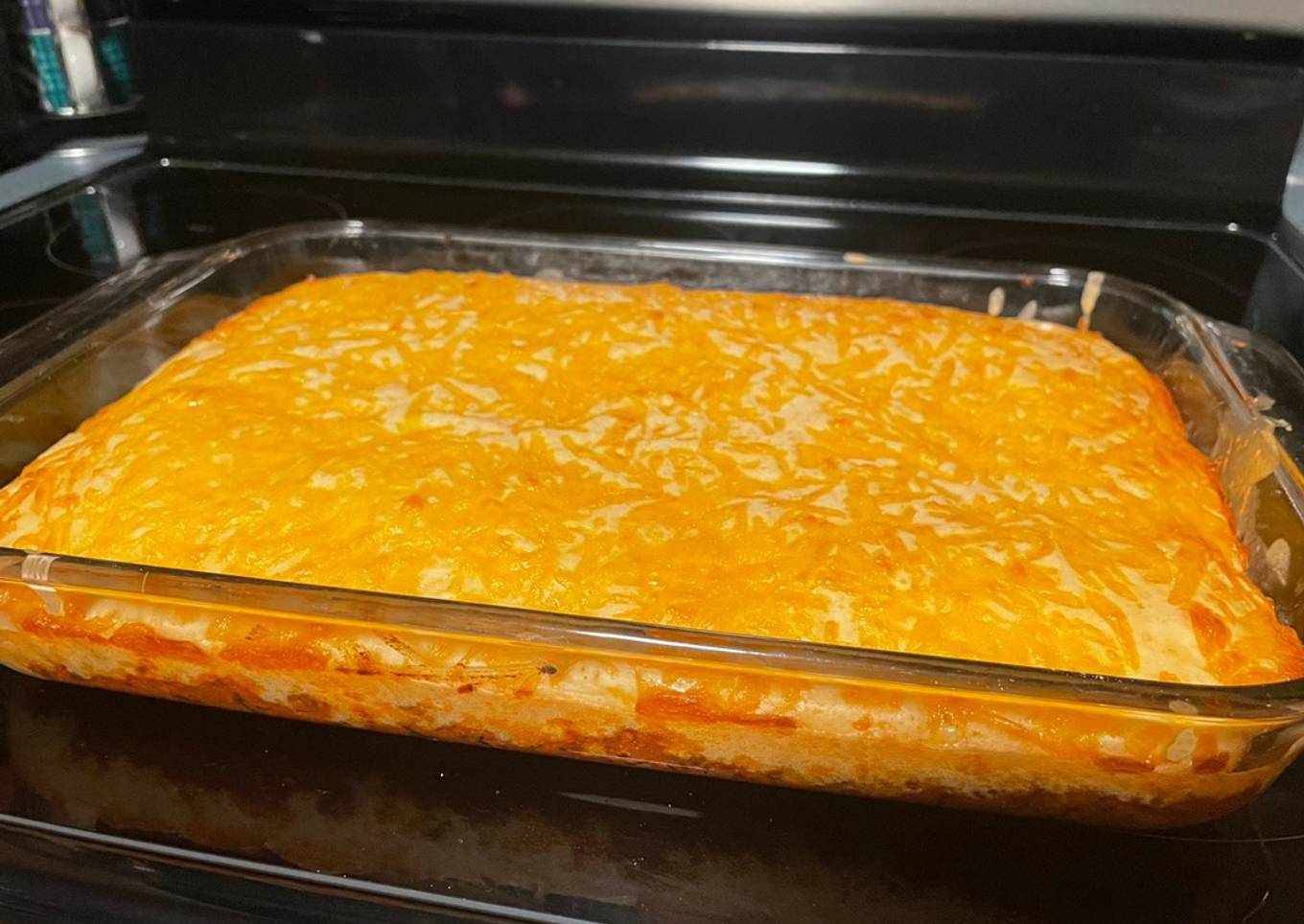 - In a 13 x 9 baking dish, pour in the beef mixture. Then pour the bisquick mixture over the top. Add 1 cup of cheese sprinkled over the top.