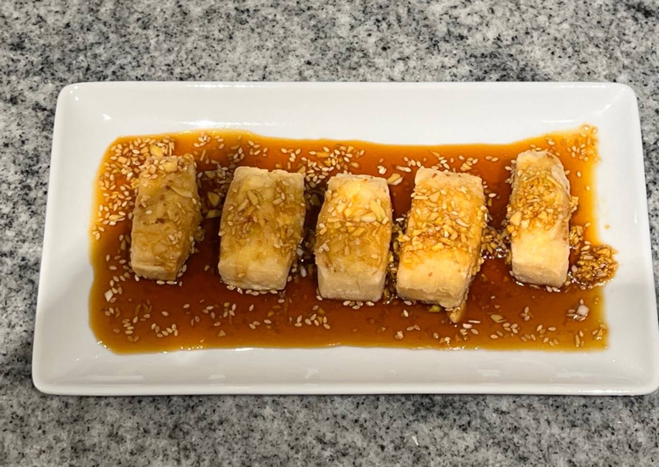 - Arrange the tofu on the plate and pour the ginger garlic sauce on the top. (Sajikan tahu goreng dalam piring dan tuang saus jahe bawang putih di atas tahu)
